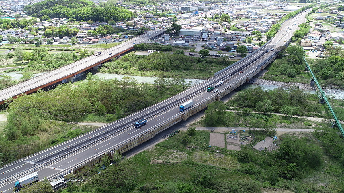 宮城白石川橋全景。手前が下り線(NEXCO東日本提供。注釈なき場合は同)