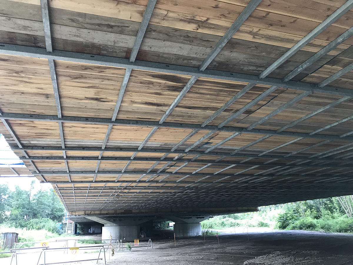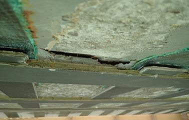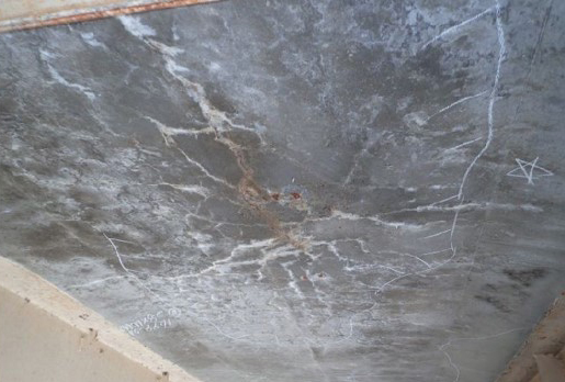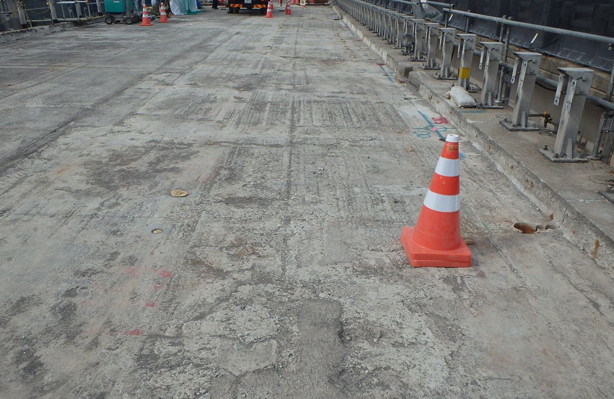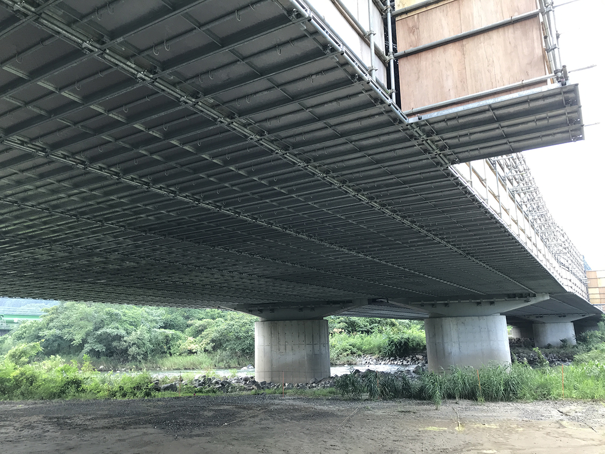 1975年の供用から44年が経過していて、2015~2017年度には、床版上面に土砂化による鉄筋露出が発生していたことから63カ所でプレミックスモルタル打込みなどの応急処置を繰り返した。床版下面は抜け落ち対策で数カ所にeプレート(炭素繊維強化プラスチック板)の設置を2015年3月に行っている。しかし、その後の調査で、床版下面で亀甲型のひび割れやエフロレッセンス、さらにeプレート付近の床版の剥離・浮きが確認された。また、舗装面のポットホール、床版上面の土砂化も発生していた。