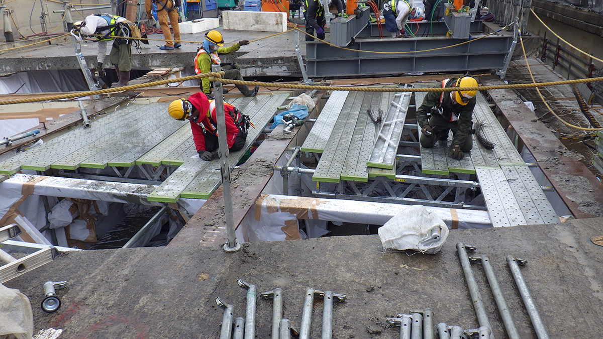 (右)中段足場(下2枚写真:大林組・横河ブリッジJV提供)