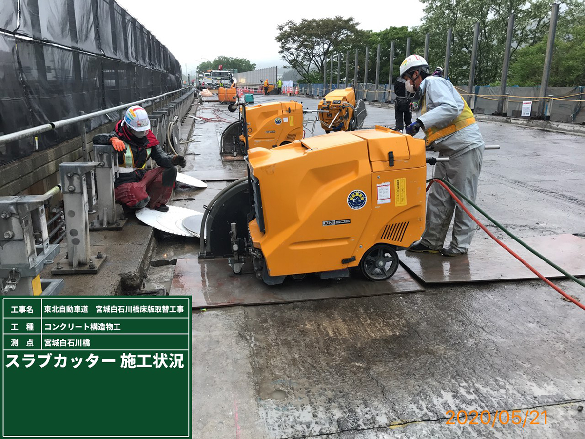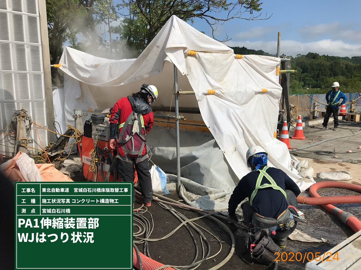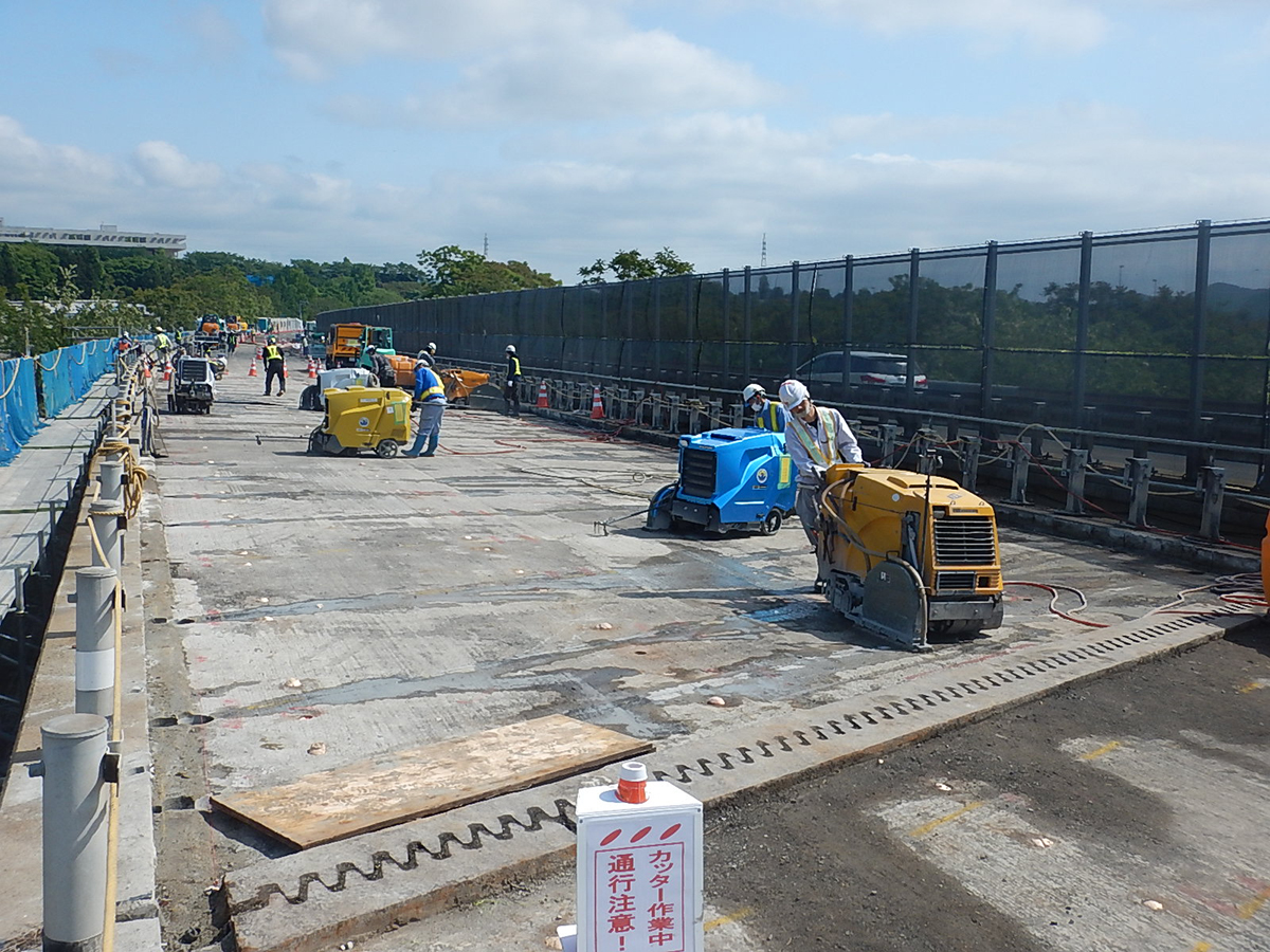 また、白石高架橋との掛違い部にあたるPA1の伸縮装置撤去はWJで行ったが、対面通行規制前の昼夜連続車線規制時に追越車線の斫りを行い、対面通行規制後に走行車線の斫りを行って、工程短縮を図っている。