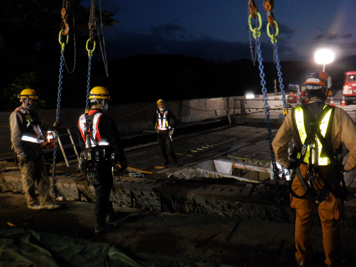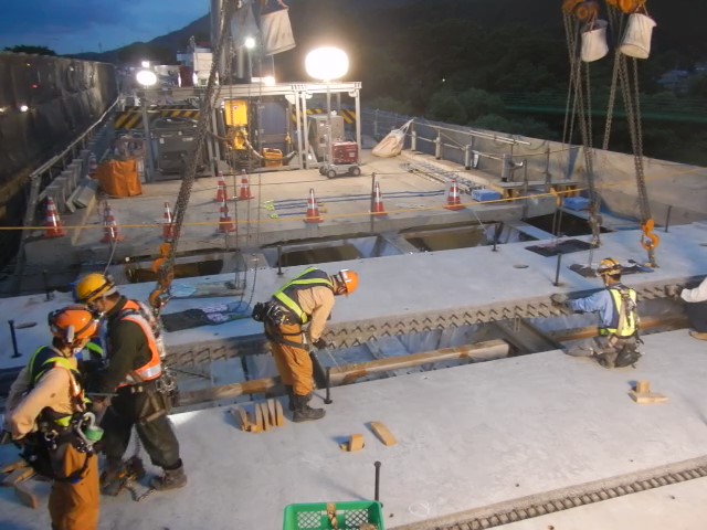 既設床版の撤去・新設プレキャストPCの架設は5月26日から開始して、基本的に夜間に既設床版撤去、昼間に桁上フランジの研掃と塗装、夜間に新設床版架設および新設壁高欄架設、そして既設床版撤去という作業を繰り返して、6月20日に完了した(計画は5月22日~6月3日)。