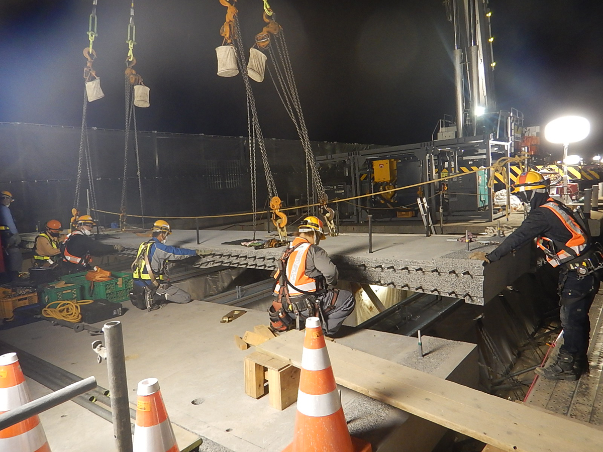 1日あたりの撤去ブロック数は、計画の24ブロック(片側12ブロック)に対して、コロナ対策により半分の12ブロック(片側6ブロック)となった。合計では、276ブロックを撤去している。新設床版の架設も同様で、計画12枚(片側6枚)に対して1日に6枚(片側3枚)、合計132パネルを施工している。新設床版のサイズは、標準版で橋軸方向2.2m×橋軸直角方向10.7m(重量約16.5t)である。