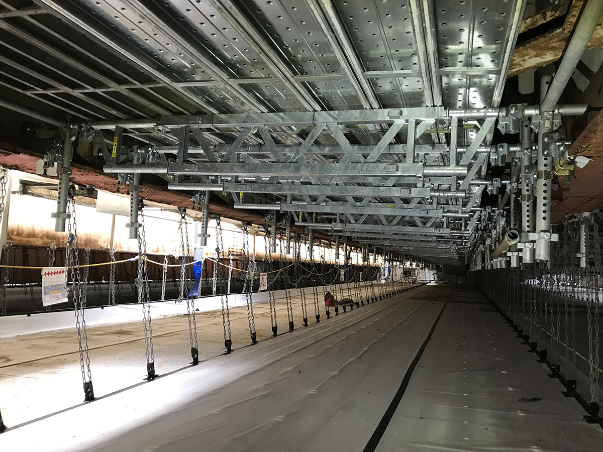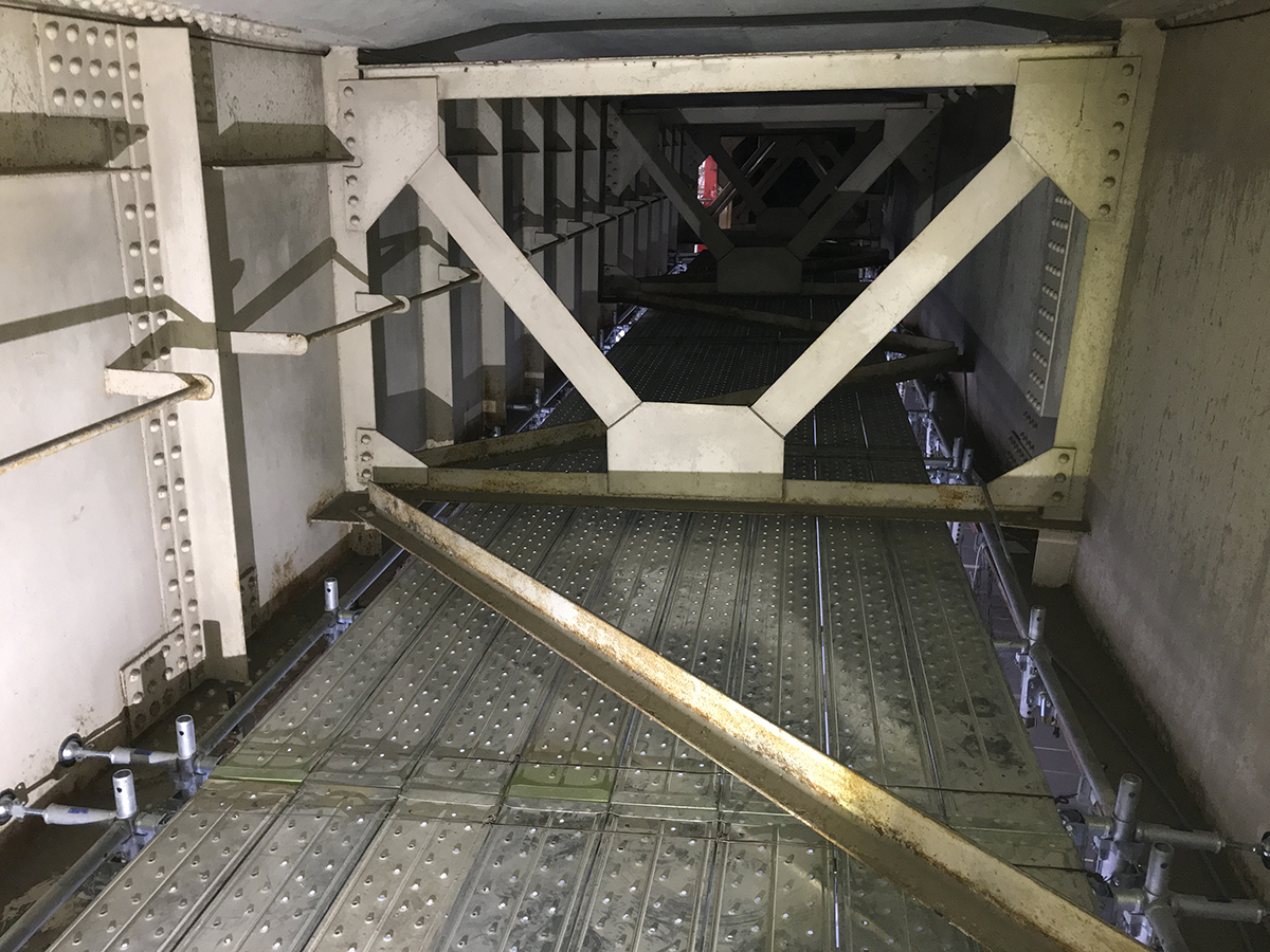 本工事にあたり、足場は吊り足場にスパイダーパネル(PA1~P4)とVMAX(P4~A2)を採用し、既設床版撤去後の桁上フランジのケレンおよび塗装作業を行うための中・上段足場には大林組とタカミヤが共同開発した「クロスリンクステージ」を採用している。