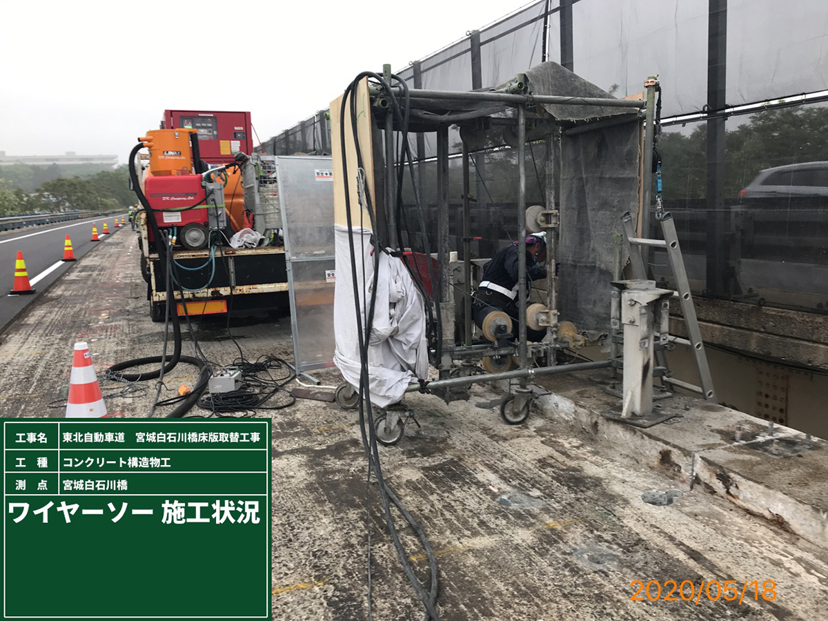 終日対面通行規制は5月19日から実施したが、その前の16日から路面切削を開始し、その後、コア削孔、既設床版の切断などを行った。既設床版はロードカッターと地覆部分はワイヤーソーを用いて、橋軸方向2.2m×橋軸直角方向5.5m(重量約9.5t)のブロックに切断。中央分離帯側と路肩側ともにガードレールが設置されていたため、あわせて撤去をしている。