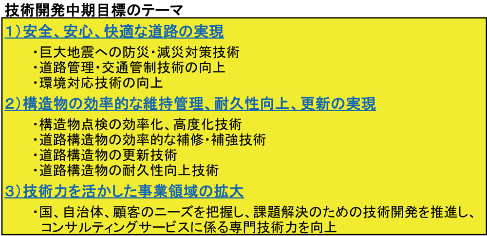 具体的目標として2014~17年度までの4年間の技術開発中期目標を定めています。テーマは「安全、安心、快適な道路の実現」、「構造物の効率的な維持管理、耐久性向上、更新の実現」、「技術力を生かした事業領域の拡大」の3分野です。第3の分野は、当社の持つノウハウを外部の機関に売り込み、収益と社会貢献を両立させようと考えているものです。いずれも推進会議で進捗状況を把握しながら、研究を進めていきます。