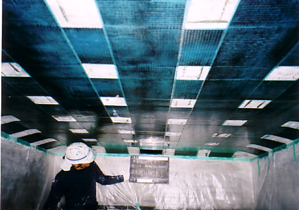 安藤 首都高速道路では、平成19年度から設計要領でひび割れや遊離石灰など、損傷のみられるコンクリート床版部へは、補修効果と確実な防水効果を得るために浸透型樹脂材料と加熱アスファルト塗膜の二重防水としています。浸透型床版防水は床版下面の炭素繊維シートの格子張り工法と併せ、床版の耐久性向上に大きく寄与していると考えています。
