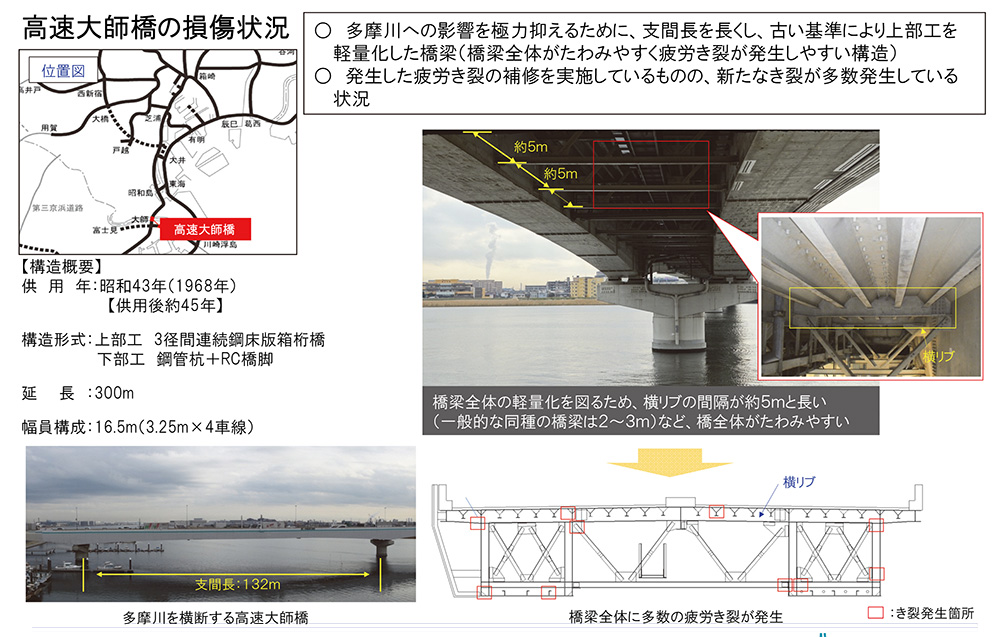 現橋は昭和43年に供用した橋長約300㍍の3径間連続鋼床版箱桁橋で供用後45年を経過しています。建設時に多摩川への影響を極力抑えるため、支間長を長くし、古い基準により上部工を軽量化した構造(横リブの間隔が5㍍と長く、桁高も3㍍と低い)であり、橋全体がたわみ易く、主桁や鋼床版のリブに多数の疲労亀裂が生じています。更新に当たっては、最新の技術基準に基づき高耐久性の橋梁に造り替えます。更新後は上部工の鋼重が増加するため、下部工や基礎も全て更新する必要があります。工事中の交通影響を軽減するため、施工中は迂回路を設けて切り替えます。