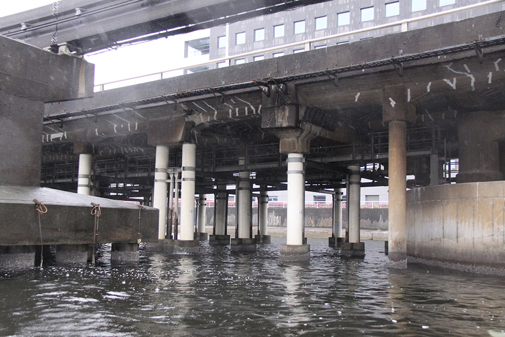 現状の東品川桟橋部コンクリートの劣化が目立つ。隣接する高架は東京モノレール