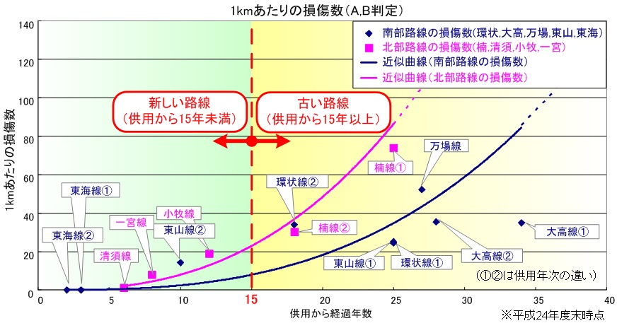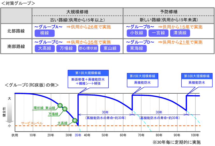 その上で損傷数と供用年数の実績により大規模修繕が必要となるサービスレベルを(環状線を境に)北部路線は26年、南部路線は35年に設定し、その時点までに、損傷を確認し大規模修繕などの対策工事を実施していきます。また、建設年次が新しい路線については北部で供用から15年、南部で同21年を目処に予防修繕を行っていきます。