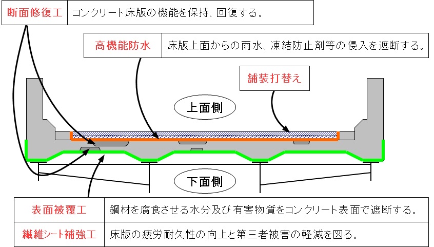 RC床版については、損傷している箇所について上面側からは断面修復工、高機能床版防水工を施し、下面からは表面被覆工(従来の被覆工だけでなくけい酸塩系などのコンクリート表面含浸材を含む)、繊維シート補強工などで対策していきます(下の図参照)。