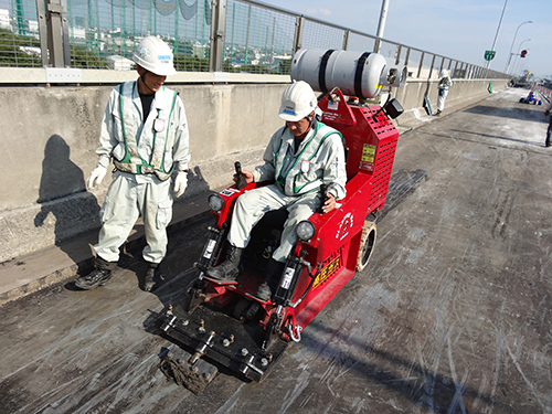鋼床版上では舗装接着層を乗用タイプなどの床剥がし機で撤去しショットブラストで下地処理する