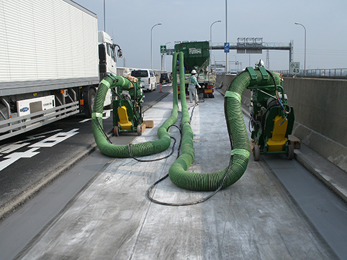 また、舗設前の処理として、鋼床版では舗装撤去後も既設接着層が残ってしまうため、それらを乗用タイプの大型剥がし機と手押しタイプの床剥がし機(ビースト、ストロングベッカー等)を用いて撤去し、その後ショットブラストで下地処理を行い、グースアスファルト舗装に打ち替えます。