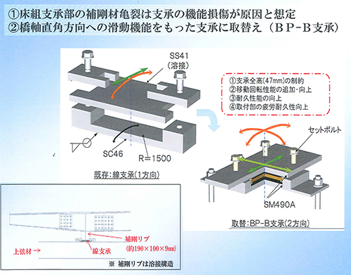 廣畑 現状の支承全高は47㎜しか無く、その中に設置可能で補剛材亀裂を生じさせない支承構造として、橋軸直角方向にも滑動機能を有したBP-B支承を設置する予定です。取替えは補剛桁を反力にして上の床組構造をジャッキアップし、撤去再設置する予定です。