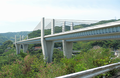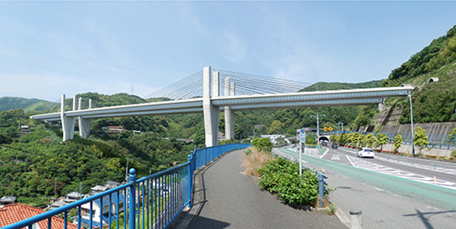 松田 日見夢大橋(373.5㍍、PC3径間連続エクストラドーズド箱桁橋)は、元々Ⅰ期線も崖地に架けられていますが、Ⅱ基線はさらに斜面が厳しくなっています。Ⅰ期線の近接施工であるため基礎への影響や上部工施工中の配慮なども必要です。
