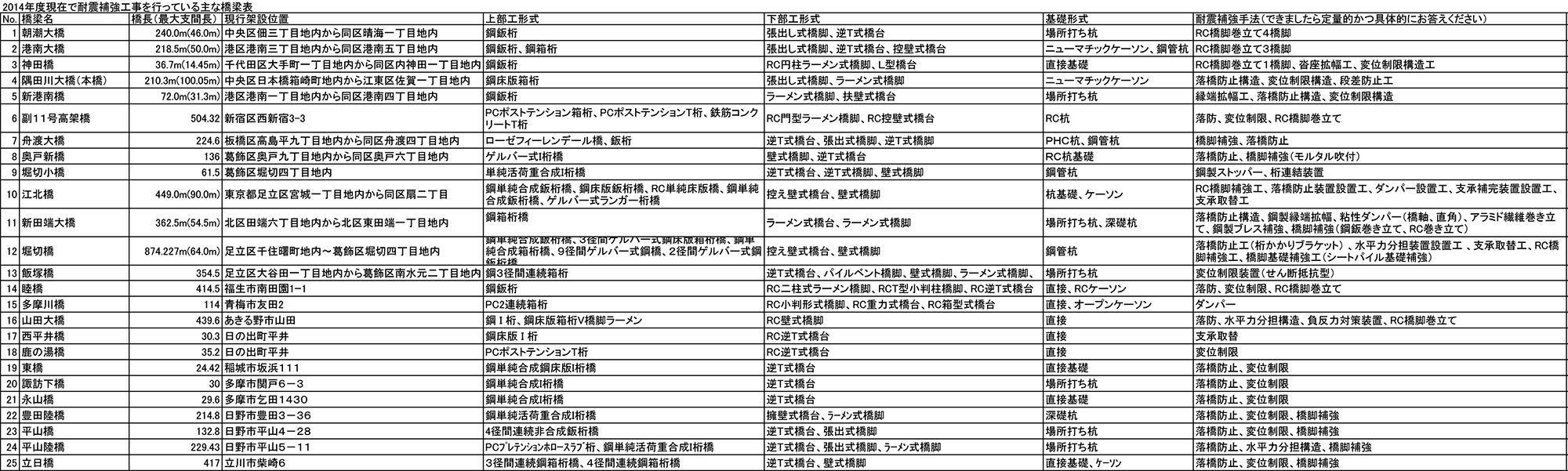 今年度は、港南大橋、飯塚橋、豊田陸橋、江戸橋、清洲橋など40橋の耐震補強工事を発注する予定です。目立った工法としては江戸橋でブレースダンパーを用いた制震的補強、清洲橋で粘性ダンパーを用いた補強工法を採用している事例があります。