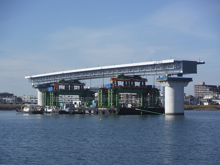 (左)妙典橋(千葉県)、(右)南本牧ふ頭本牧線(Ⅴ工区)高架橋上部工事(国土交通省関東地方整備局)(いずれも宮地・三菱JV)