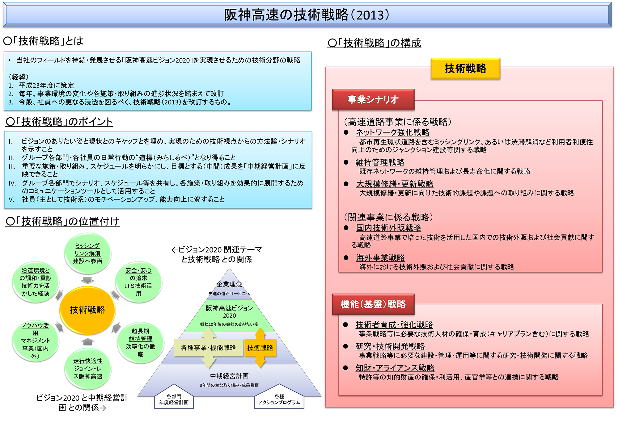 実は、民営化後の2010年に10年後の我々のありたい姿を示してみようということで「ビジョン2020」というものを作りました。それを実現するために道路事業、関連事業をどう進めていくかを構築しました。それが「阪神高速道路技術戦略」です。