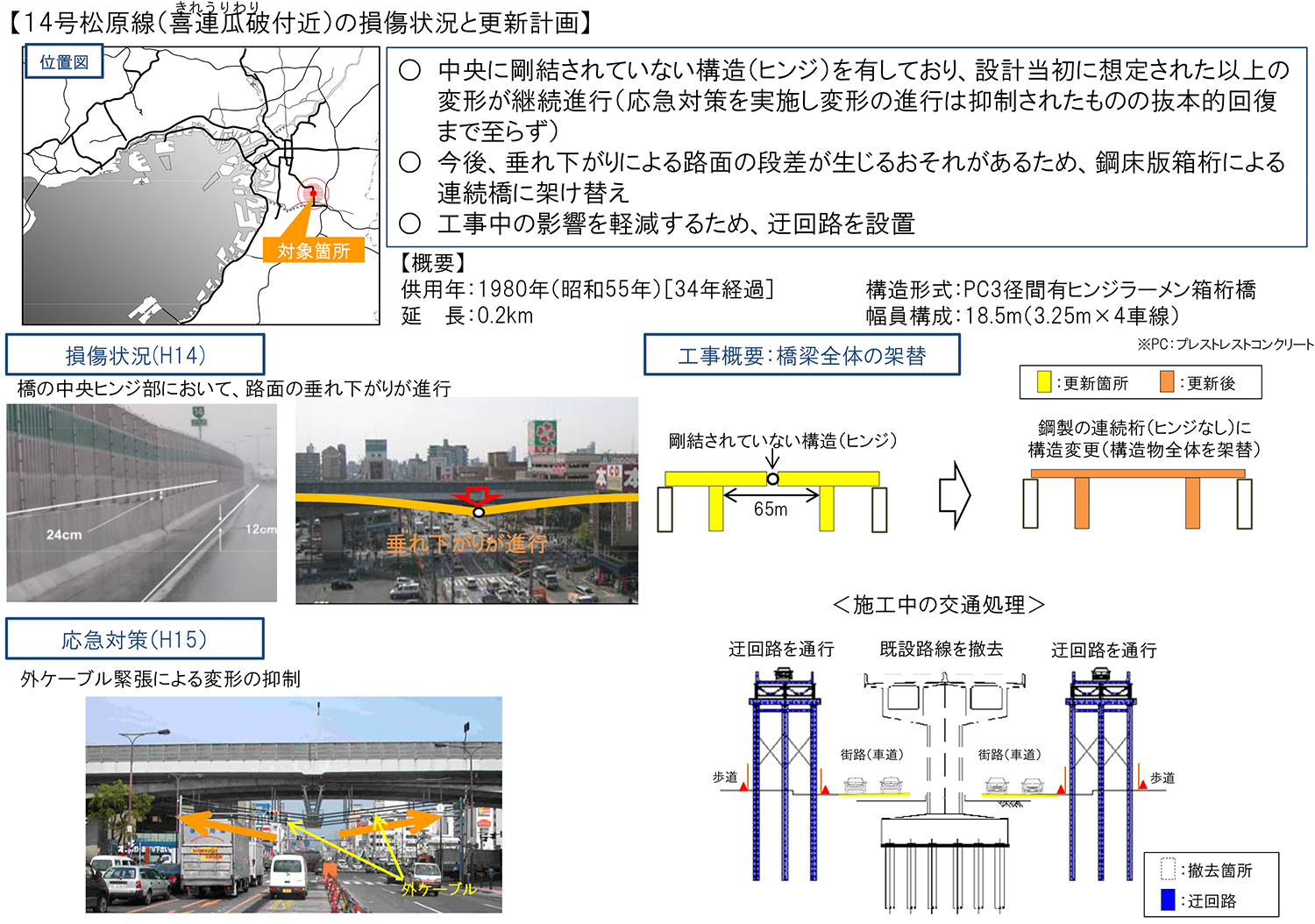 喜連瓜破高架橋の更新計画概要と現況の写真