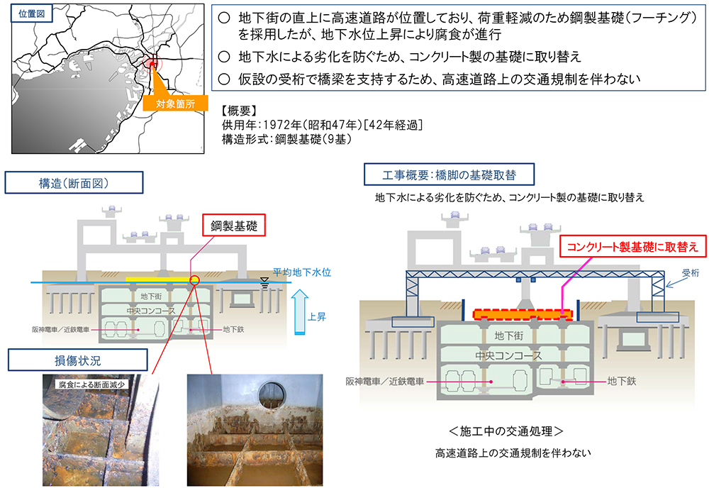 その1つが湊町付近の鋼製フーチングです(9基)。ここは阪神高速道路の高架橋基礎だけでなく、そのさらに下に地下街、さらにその下に地下鉄や近鉄の鉄道構造物が存在している非常に複雑な構造です。同箇所の損傷要因は地下水の上昇による鋼製部材の発錆、腐食ですから、早い時期に手をつけたいと考えています。構造的に地下鉄や地下街を抱いている関係上、そう簡単に直せる構造物ではないため、先日共同研究のアイデア募集をして2社と進めています。