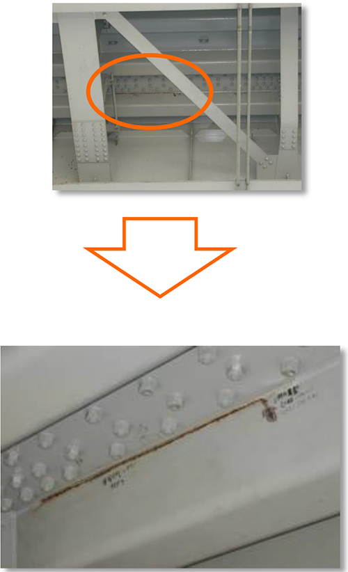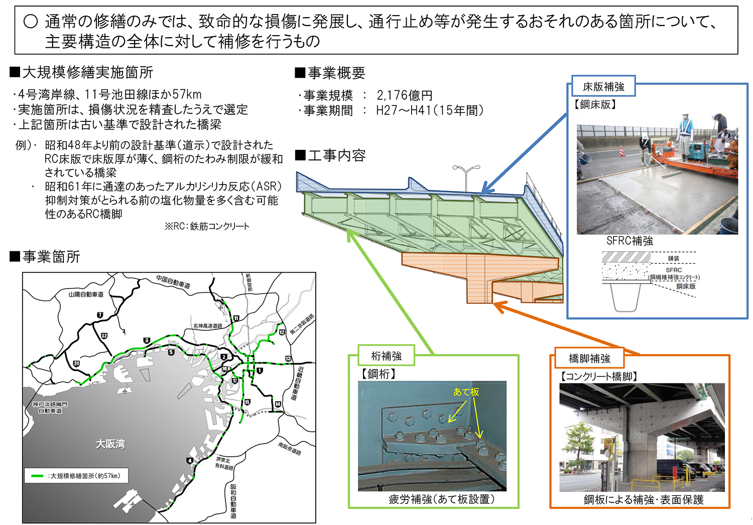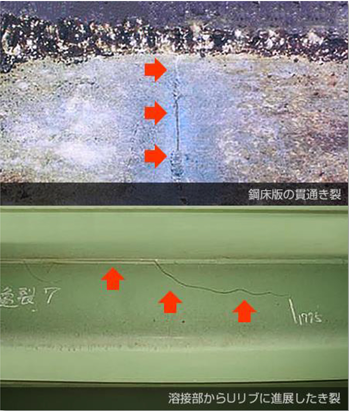 大規模修繕の対策概要(左)と鋼床版の疲労亀裂(中)、(右)