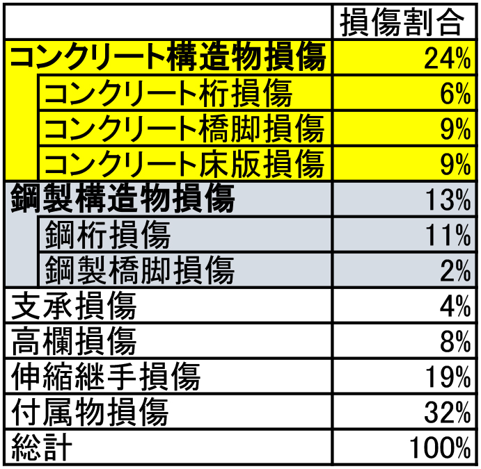 圧倒的に舗装とジョイントと塗装が非常に多いと言えます。コンクリートも鋼も損傷している部位は圧倒的に上部工です。原因は輪荷重と水の問題だと思っています。