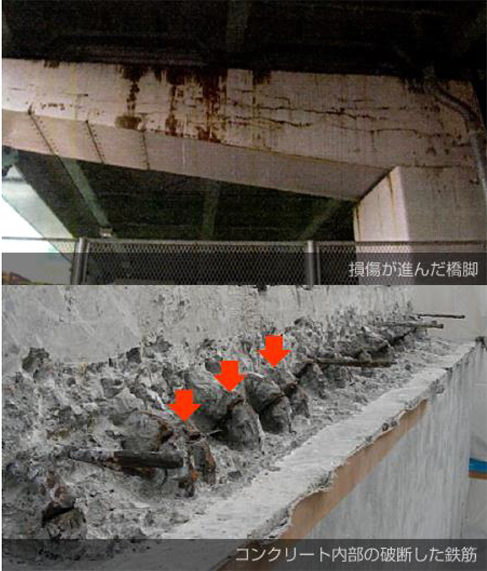 損傷が進んだ橋脚(左)、矢印部の拡大写真(右)