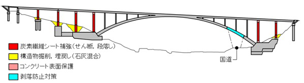 福永 最近では別府明礬橋(PC2径間ラーメン+上路式RC固定アーチ橋、410㍍)を耐震補強しました。具体的には部材の性能評価の高度化を図り、極力部材の性能を活かすことで当初のプロポーションを変えない耐震補強を実現することができました。