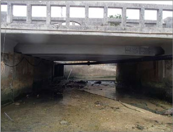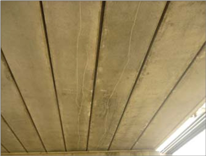 嘉手納 同様に飛来塩分、加えて供用年次を勘案すれば内在塩分による影響の可能性もある塩害により、ひび割れ、剥離・鉄筋露出、漏水・遊離石灰、浮きなどの劣化が生じています。塩化物総量規制(1986年)より前に建設された小規模RC橋では内在塩分量が鉄筋近傍まで高い箇所が見られます。これらは建設時に十分(コンクリート製造に使用した海砂が)洗浄されず、劣化の主な要因になっているものと推定されます。