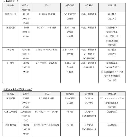 また、その他の損傷劣化としては、白銀橋、我部祖河橋でプレテン桁の一部にアルカリシリカ反応に似た性状のひび割れが確認されています。