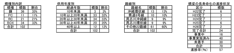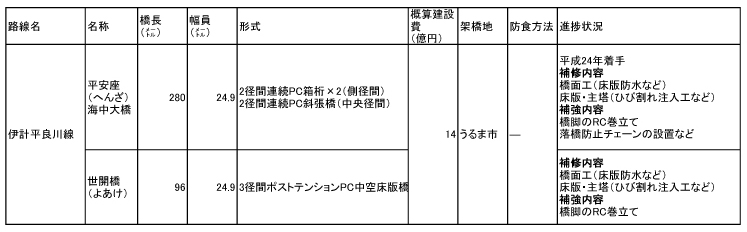主要地方道の伊計平良川線の世開橋で橋脚のRC巻立ておよび打増し、県道153号のCランプ橋で橋脚のRC巻立て、炭素繊維シート貼付けによる補強を行っています。