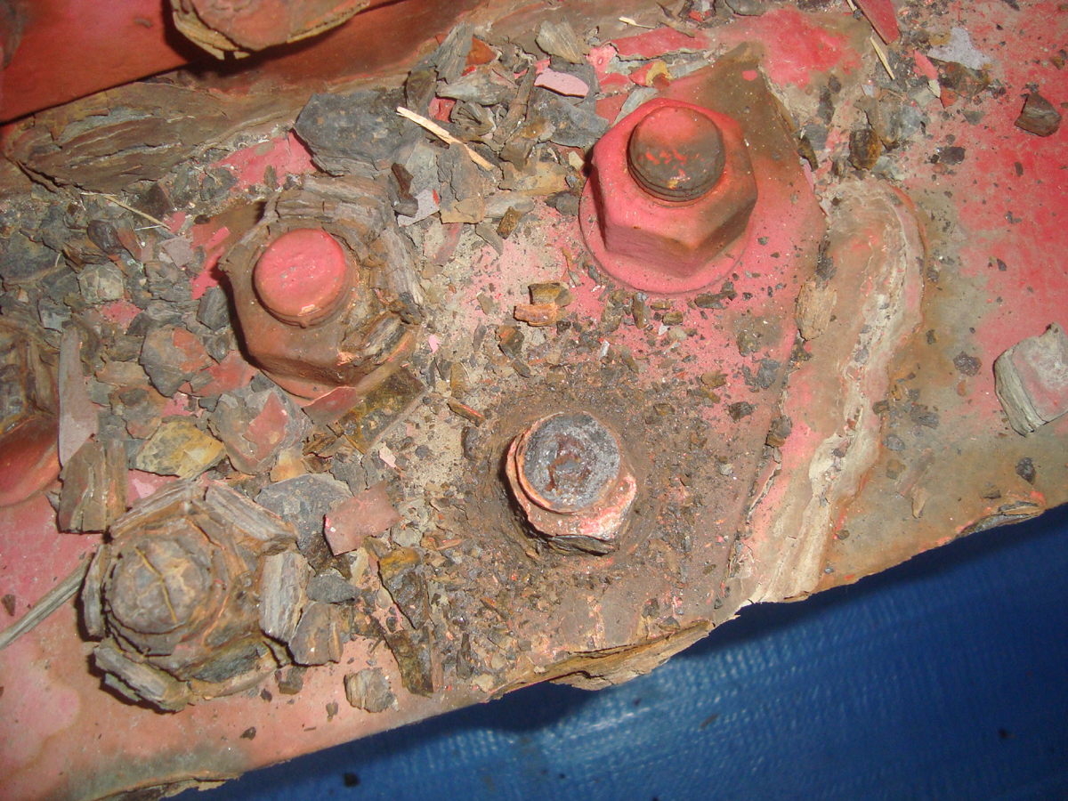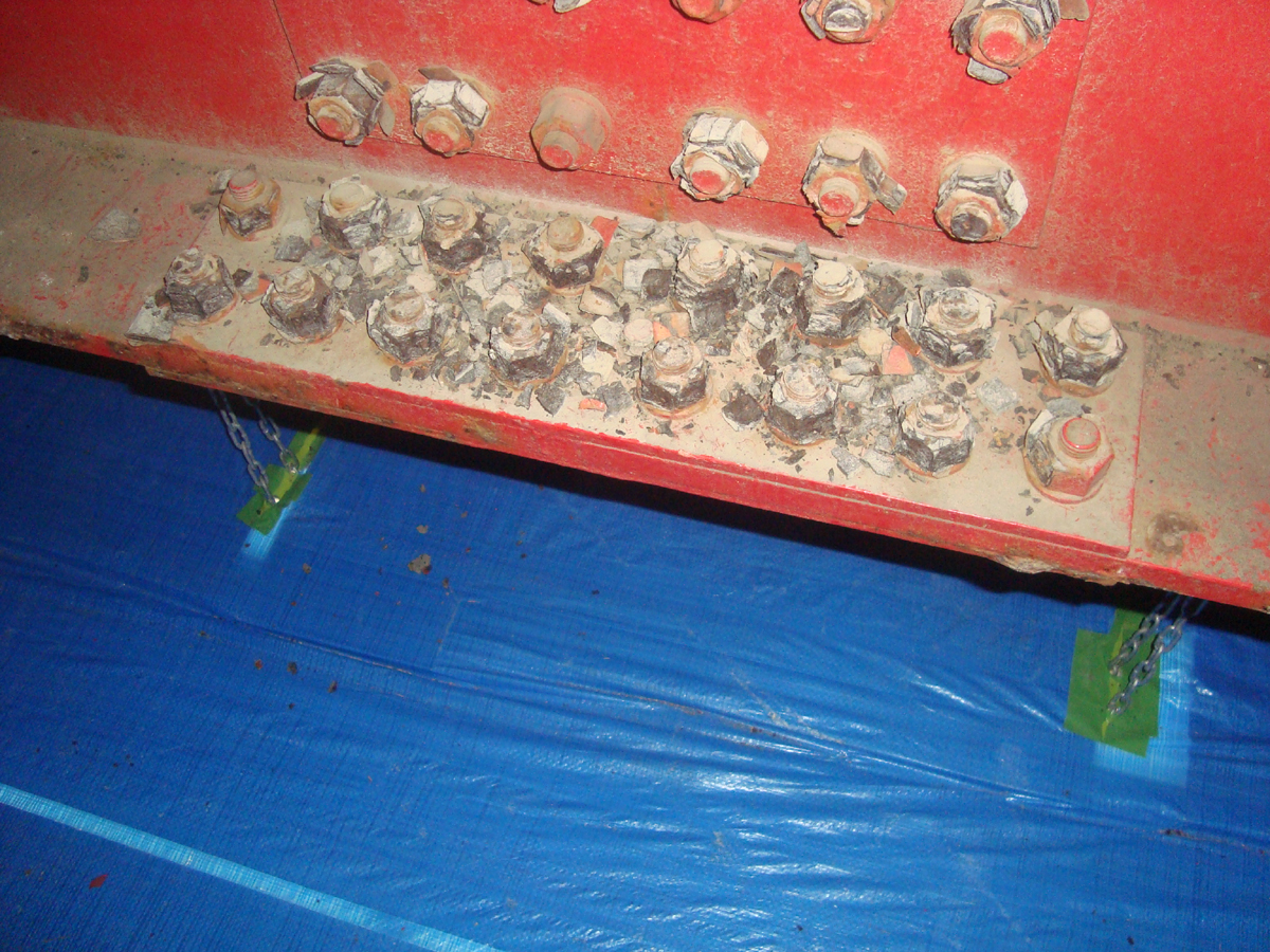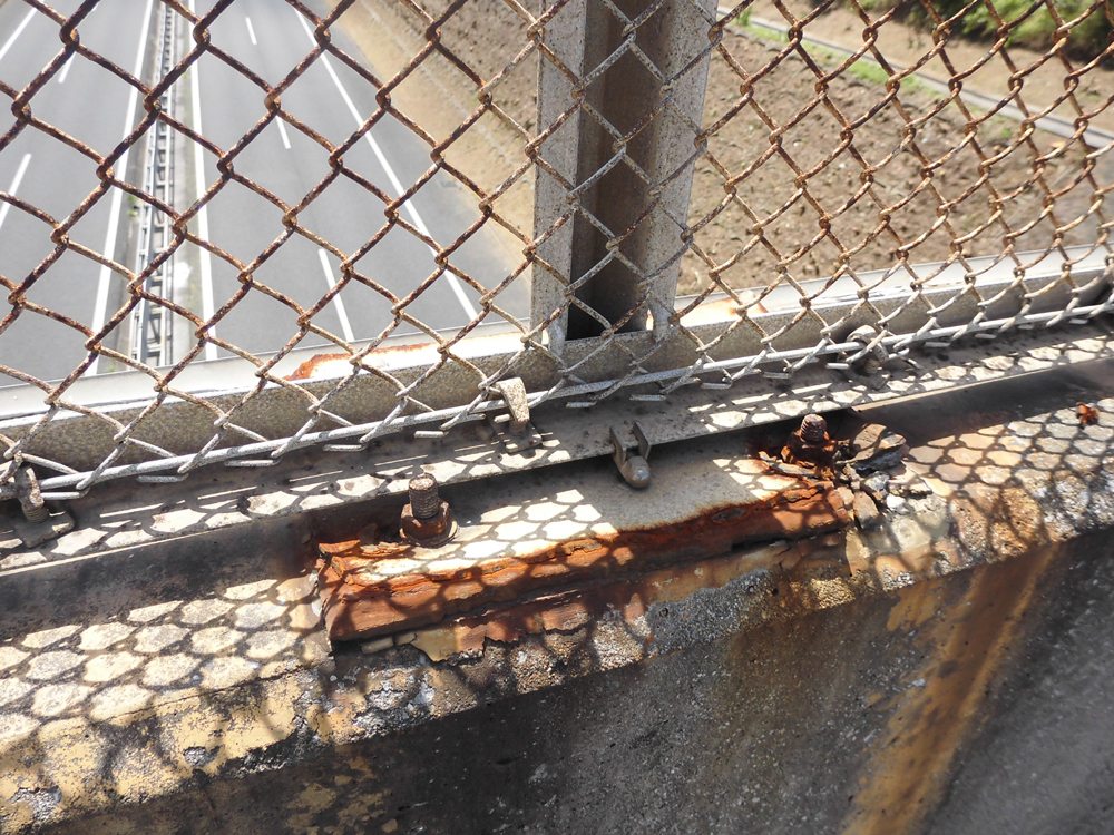 高欄の損傷状況はコンクリート部接続ボルトの腐食で、主な要因は雨水等によるものです。