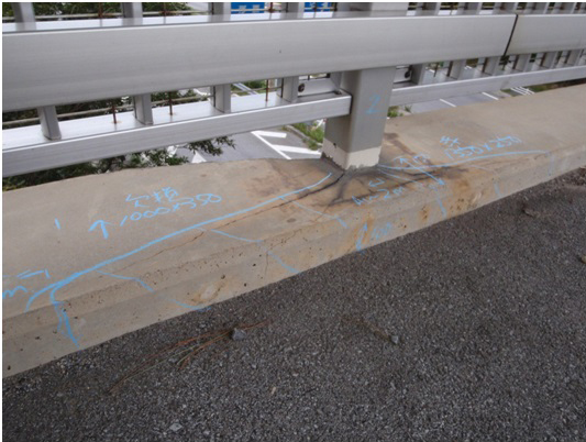 地覆もコンクリートの浮き・剥離、鉄筋腐食が生じています。