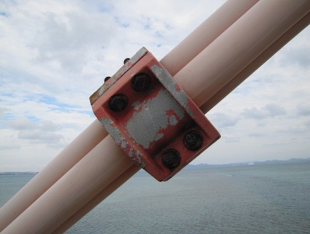 主な補修補強としては平安座海中大橋(280㍍、中央径間が2径間連続PC斜張橋、左右側径間が2径間連続PC箱桁)で平成24年から補修補強に着手しており、床版・地覆のひび割れ個所への注入工(「DDビックス工法」)及び断面修復工、落橋防止チェーンの設置などを行っています。また、塩害対策として表面含浸工(「プロテクトシルCIT」)も実施しています。