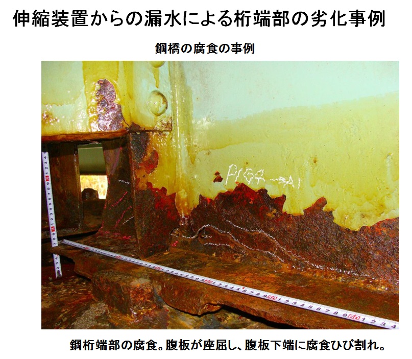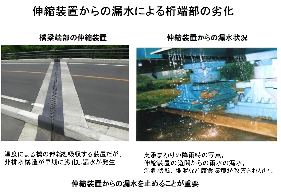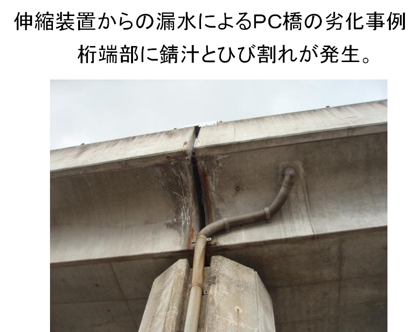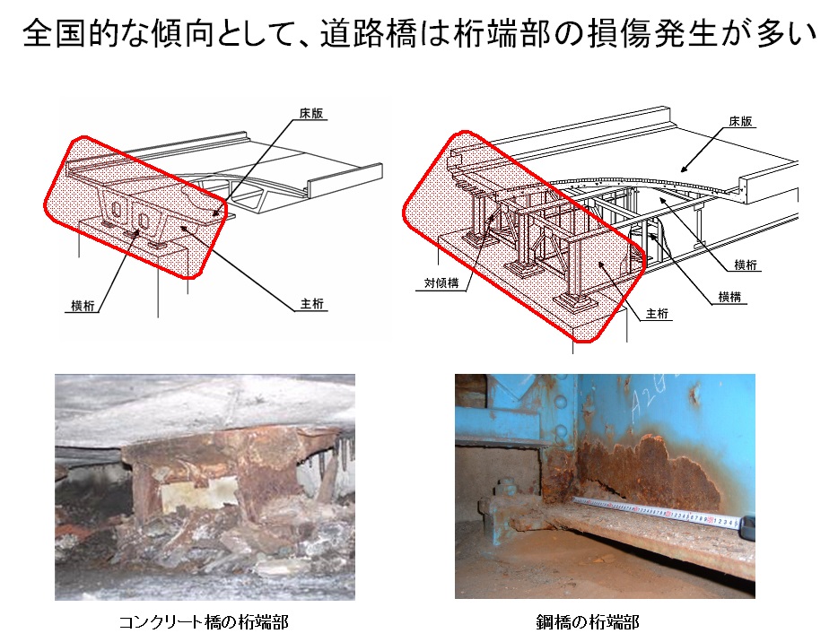 原因としては、除雪による凍結防止剤を含んだ雪堤が解け融雪水が下へ伝って流れてしまい、その水みち沿いに塩分が浸透し、劣化が生じていると考えられます。また、一部で施工不良などによる漏水箇所からも水が伝い劣化を生じさせているケースもあります。また、伸縮装置は非排水型の製品を使っていますが、東北地方整備局管内では平均6年ほどで非排水機能を喪失しています。非排水部分に泥や雪が押し込まれその圧力により非排水機能が壊れてしまうようで、そこからの漏水による損傷も顕著です。加えて凍結融解により損傷が起きている個所もあります。桁端ではウエブやフランジの腐食・欠損、橋座、支承の鋼材部の腐食・欠損が生じている個所もあります。また床版の打継ぎ目からの漏水、スラブドレーンを横引き排水管につなげていない個所からの流水による損傷も散見されます。コンクリートの初期欠陥(微細ひび割れやコールドジョイント)も少なからず影響しています。これらの要因により早いところでは13年程度で損傷している橋梁もあります。
