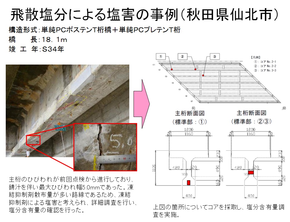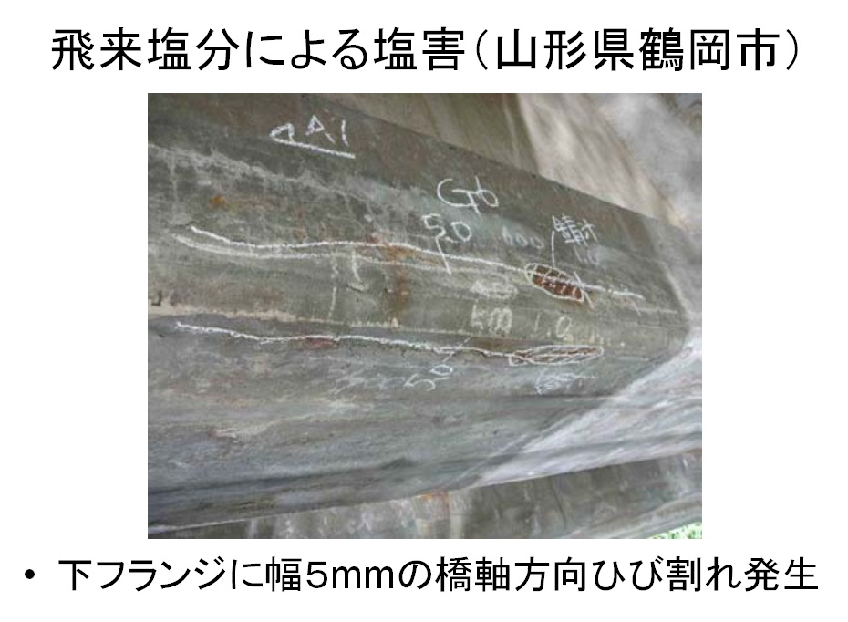 佐藤 東北地方整備局は3,000橋あまりある橋梁のうち、5年以内に補修する必要のある橋は2橋に1橋の割合に達しています。要因としては凍害および凍結防止剤散布による塩害が考えられます。東北地方整備局管内の凍結防止剤の平均散布量は1㌔あたり年間約10㌧で、峠部および日本海側では同30㌧と内陸でも海岸線の飛来塩分量とほぼ同等の塩分影響が与えらてしまう状況です。例えば湖山橋(秋田県仙北市内、国道46号)は、供用後34年で架け替えました。同橋は横断勾配の低い方の外桁内に塩分を含んだ水が滞水し、内部鋼材を腐食させて桁下面のコンクリートが剥離していましたが、はっきりした水みちはわかりませんでした。また、ある橋梁では供用から15年で地覆部の鉄筋が露出したり、壁高欄の付け根からコンクリートの浮きが見つかっており、調査したところかぶり深さ50㍉の位置で鋼材の発錆限界地1.2㌔/立方㍍を超過する塩化物イオン量が確認されました。