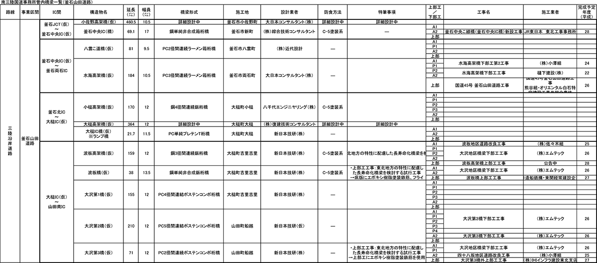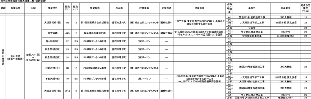 主な構造物はトンネルが釜石トンネル(873㍍)、八雲第1トンネル(635㍍)、同第2トンネル(839㍍)、同第3トンネル(149㍍)、水海トンネル(445㍍)、鵜住居第2トンネル(1,445㍍)、小鎚第1トンネル(309㍍)、同第2トンネル(975㍍)、大槌第1トンネル(256㍍)、同第2トンネル(2,043㍍)、橋梁が小佐野高架橋(460㍍)、浪板高架橋(159㍍)、浪板橋(38㍍)、大沢第2橋(210㍍)、同第3橋(71㍍)です。