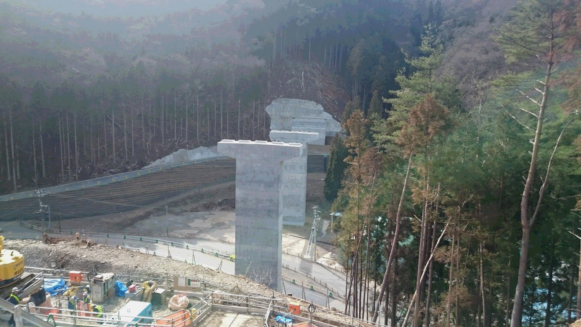 現在は大沢高架橋の下部工3基、向定内橋の上下部工、不動沢橋(橋長19㍍)の下部工、大畑高架橋のA2橋台が完了しています。※以上の構造物名称は全て仮称