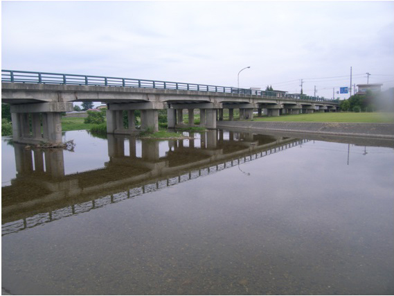 村山地方では山形市内で直轄河川(須川)の河川改修事業に伴う飯塚橋の架け替え(橋長212㍍、鋼3径間連続鈑桁)を行っています。現在は上部工の架設を完了し、床版工を進めており、平成27年度中の完成を見込んでいます。