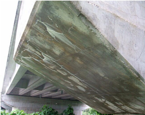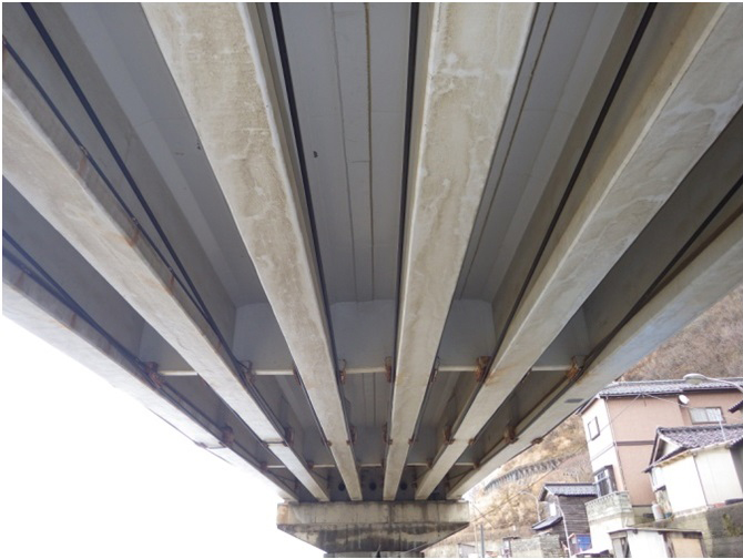 塩害の代表橋梁としては金沢陸橋(鶴岡市金沢)があります。PC桁が塩害による損傷を起こしており、外ケーブルや炭素繊維シートによる補強を施しています。