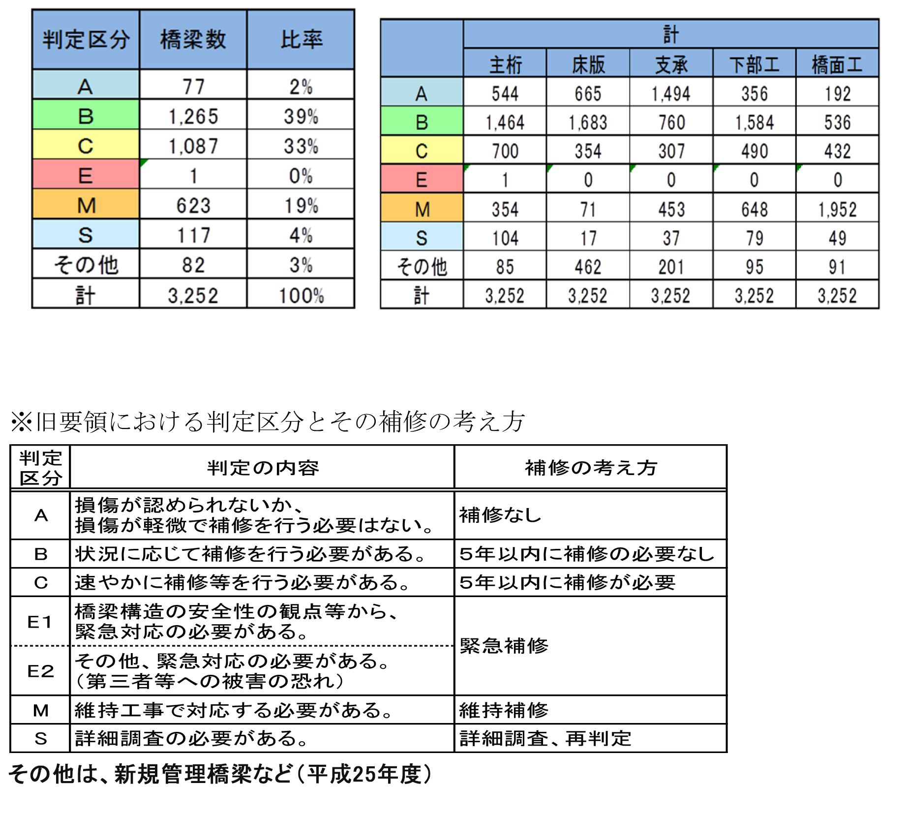 喜安 (平成26年度については現在、集計中のため)平成25年度までの点検結果においては、管内3,252橋の内、A判定77橋(2%)、B判定1,265橋(39%)、C判定1087橋(33%)、E(要緊急対応)が1橋、M(要維持工事対応)が623橋(19%)、S判定(要詳細調査)が117橋(4%)です。(平成16年橋梁定期点検要領(案)による判定区分)。