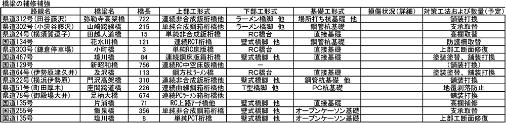 今年度は2順目の点検結果で見直した箇所で出た損傷対策も含め14橋で対策を行う予定です。主な橋梁としては弥勒寺高架橋(722㍍、県道312号田谷藤沢、藤沢市道およびJR東海道本線を跨ぐ高架橋)などを補修する予定です。
