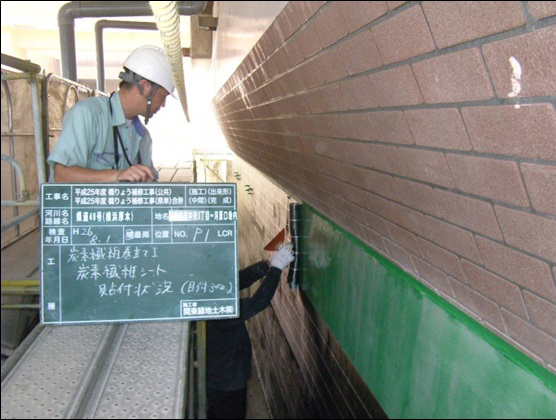 (写真左)県道40号(横浜厚木)海老名跨線橋の炭素繊維シート貼付状況/