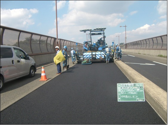 (写真右)県道312号(田谷藤沢)弥勒寺高架橋の橋面舗装アスファルト舗設状況