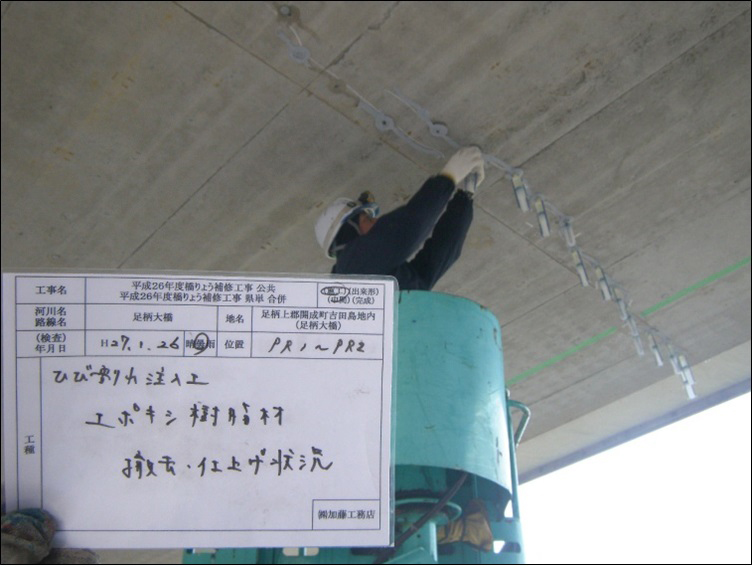 (写真左)県道78号(御殿場大井)足柄大橋のひび割れ注入エポキシ樹種注入・仕上げ状況/