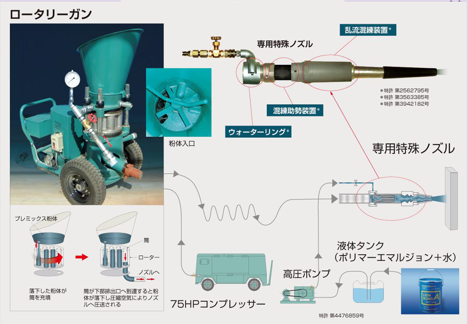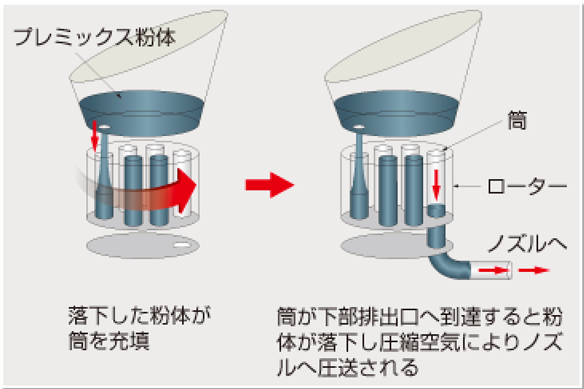 施工法の元になった乾式吹付け工法の機構概要(左)/ロータリーガンによる粉体圧送のメカニズム(右)