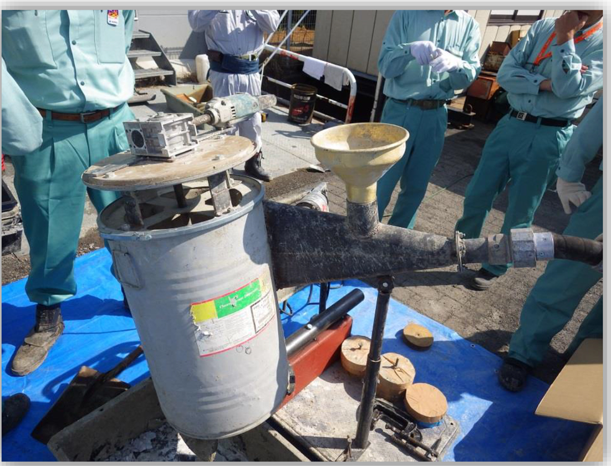 ロータリーガンへのプレミックス材料の投入(左)/減速装置から排出される材料(右)
