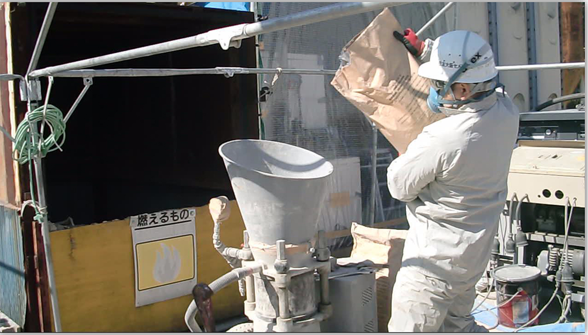 蔵治 移動式プラントを使わずに材料を混合する手法として乾式吹き付け工法に着目しました。乾式吹付工法は首都高速道路では東京港トンネルの補修で採用されています。同工法は、専用のロータリーガンとコンプレッサーが脈動なく粉体を圧送し、ポンプがポリマーエマルジョン添加の混練水(液体)を圧送します。この工法は材料を200㍍先の現場まで圧送することができます。ホースの中を時速約200㌔で飛来してきた粉体と液体は専用特殊ノズルの中で瞬時に混合され、均一に練り上げられ、速度を維持したまま状態でノズルから飛び出し、対象物に吹き付けられ固着します。しかし、床版の上面増厚の場合は時速200㌔で材料が飛び出してきては困るわけです。そこで、専用特殊ノズルの中で材料の混合が終わりましたら、徐々に速度を落として空気を抜き、RC床版上に打設する減速機を開発しました。