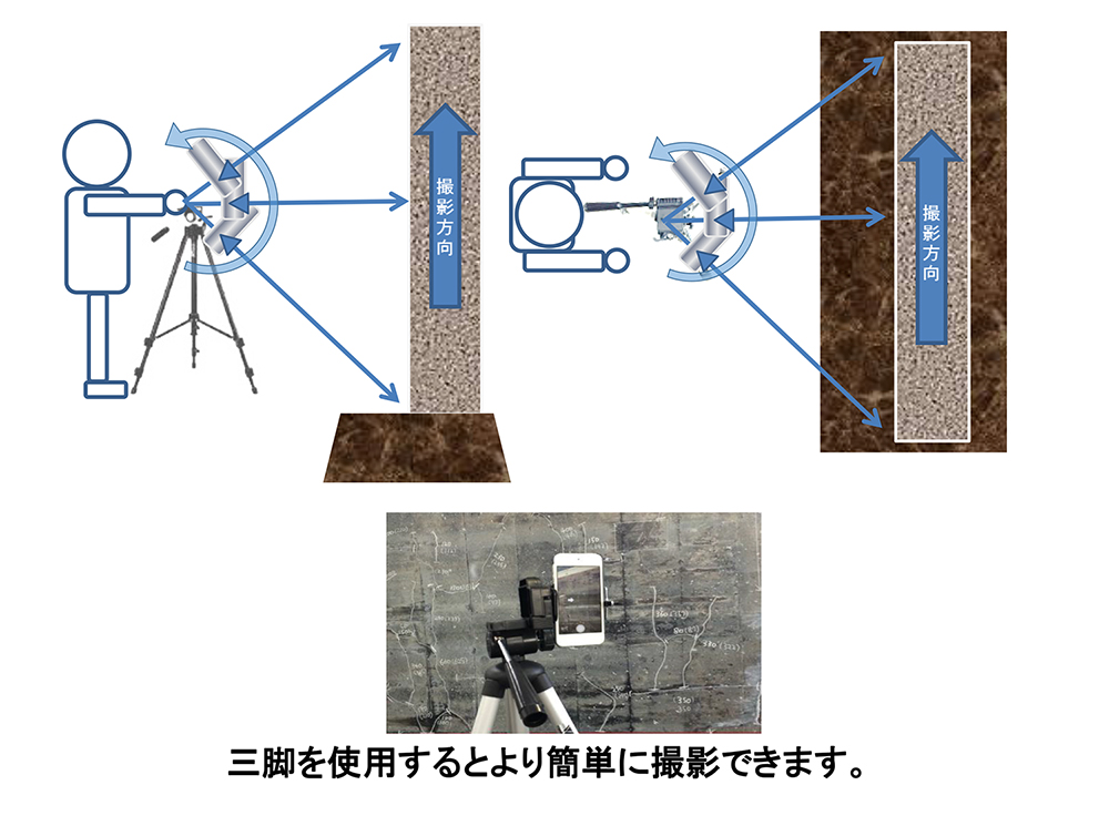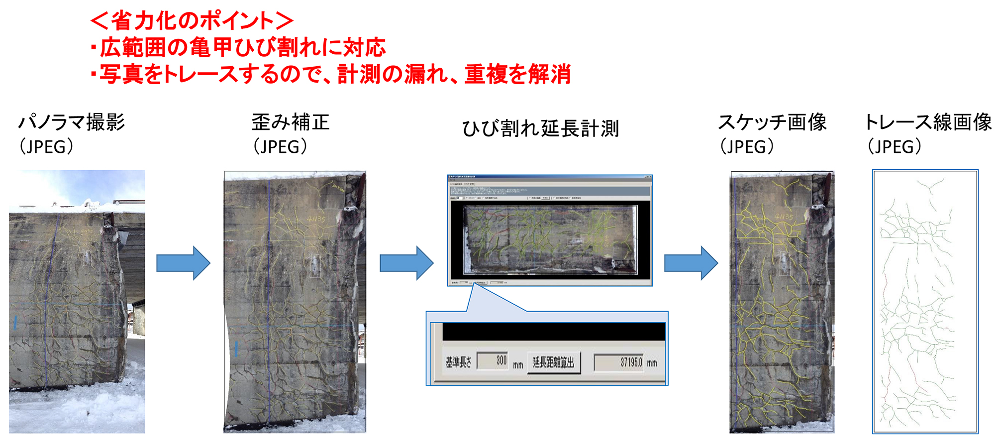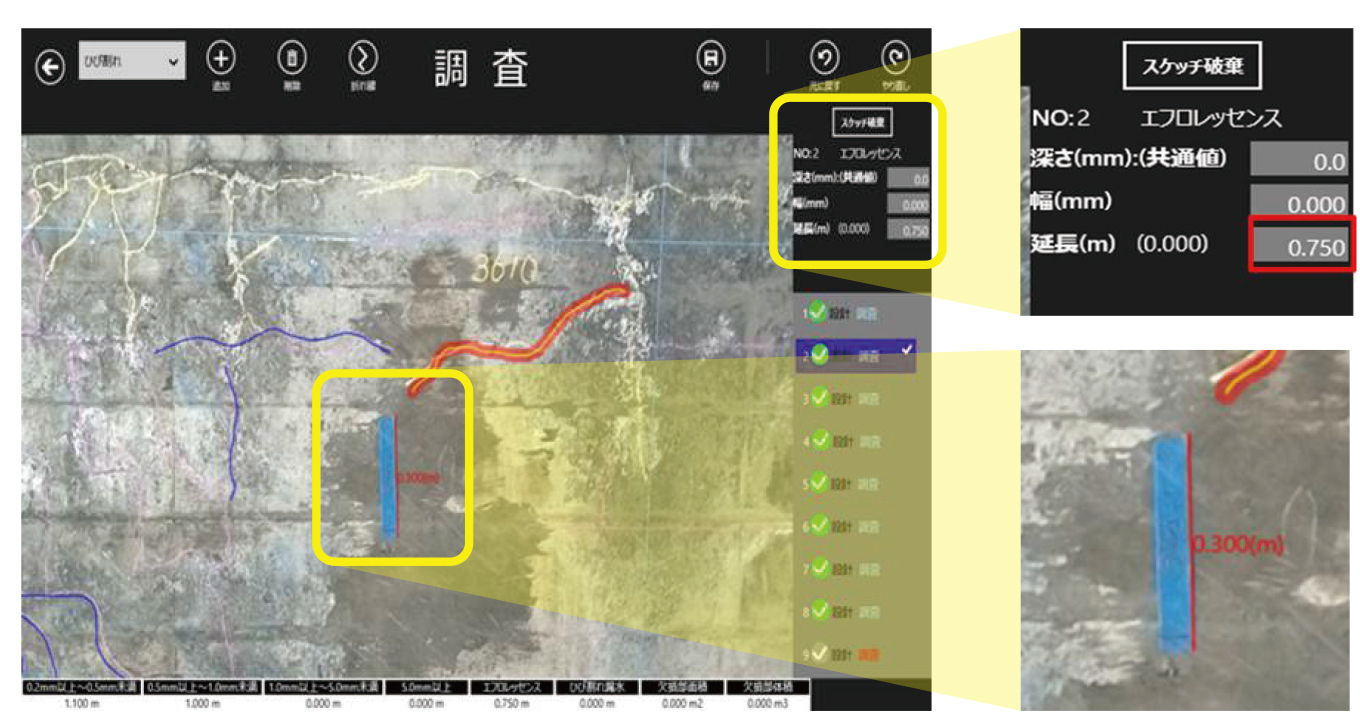 竹内 例えば足場上で床版の写真を全面にわたって撮影するのは難しいですが、iphoneやipadに備わるパノラマ撮影機能を使って撮影し、それを精緻化(正置化)してその上からひび割れをスケッチすることで、全延長が測れるといいうシステムを作っています。亀甲ひび割れがあった際に、その煩雑な計測を何とかしたいと考えたのがこのシステムを制作した発端です。作業は非常に簡単です。当該作業における人工を3分の1に縮減することが可能です。このデータをピトレに入れることで、さらなる作業の効率化、スマート化が実現できます。