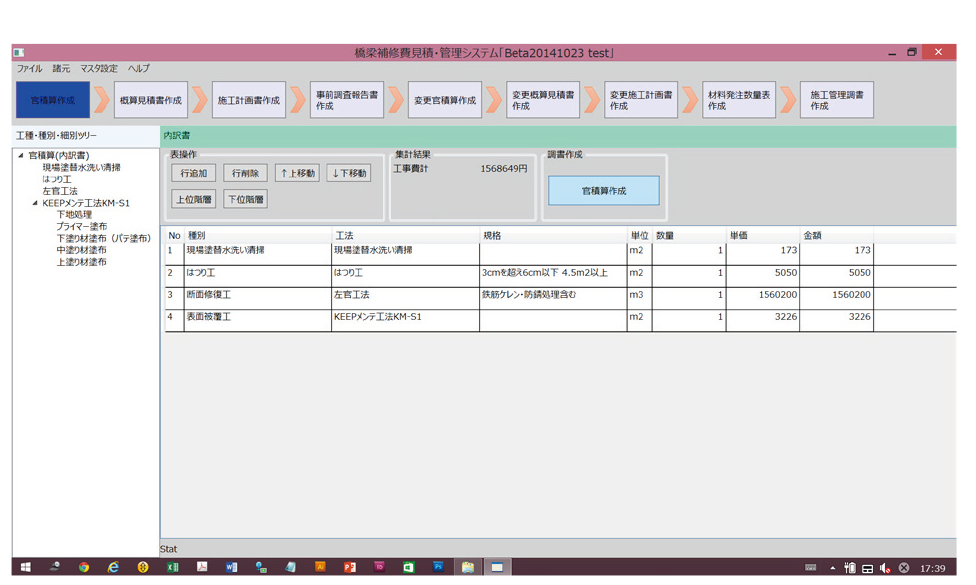 基本的には最新の「国土交通省土木工事積算標準」データを基に橋梁補修工事に関わる様々な工種の積算を行えます。また、現在の積算の歩掛りでは価格が合わないという事もあります。そうしたものも、実績を元にした実勢価格を見積データとして用意しており、概算を出せます。そうなると、何が足りないのかということが発注者と協議できるようになります。その後は、受注してからの施工計画書が積算と連動していまして、そこで積算した材料に基づく計画書が出来上がります。それもエクセルベースで出来上がってきますので自由に手を加えることができます。数量関係も積算で出したものがそのまま反映できます。その延長線上として出来高調書なども作成できます。