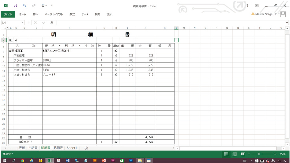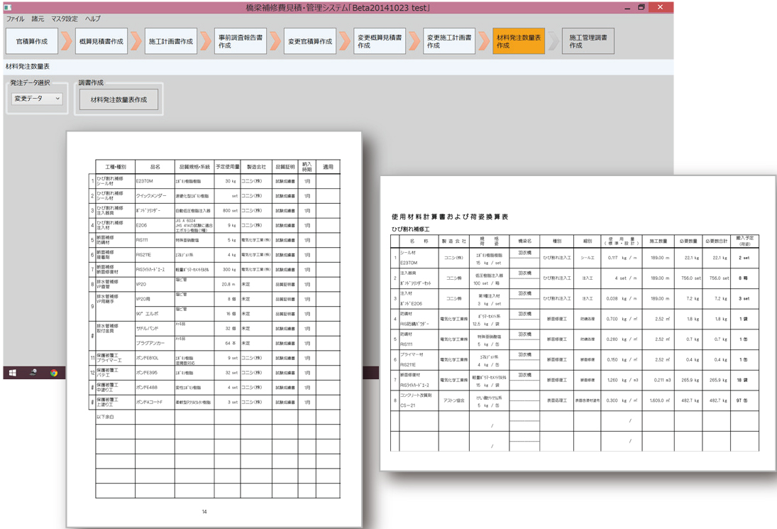 たかだか断面修復でも材料の選定いかんで価格が変わってきます。表面被覆や剥落防止工ではそうした傾向が顕著でしょう。それを防ぐため、色々なメーカーの材料を使って積算できるシステムを構築します。官積算・概算見積書・施工計画書・事前調査報告書・材料発注数量表・施工管理調書に対応しております。